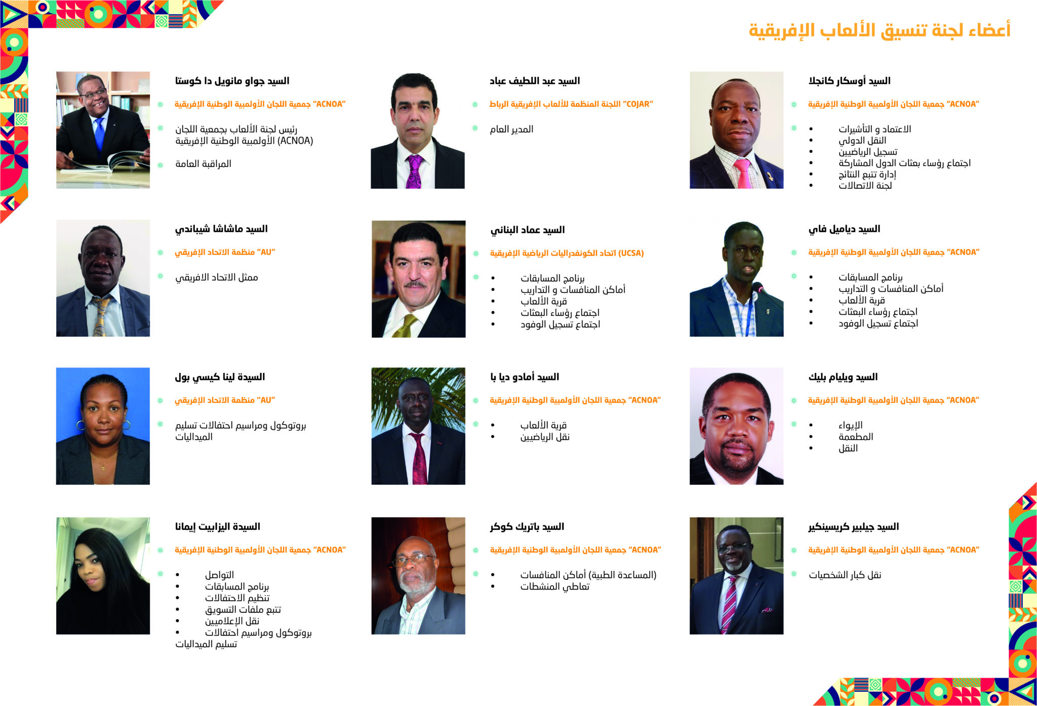 تتألف لجنة تنسيق الألعاب الإفريقية من ممثلين عن الاتحاد الأفريقي وجمعية اللجان الوطنية الأولمبية الإفريقية واتحاد الكونفدراليات الرياضية الإفريقية. وتتمثل مهمتها في تنسيق الجوانب التقنية والتنظيمية لدورة الألعاب الإفريقية الثانية عشرة الرباط 2019، ومرافقة مسؤولي اللجنة المنظمة المحلية (COJAR) في مختلف مهامهم.
