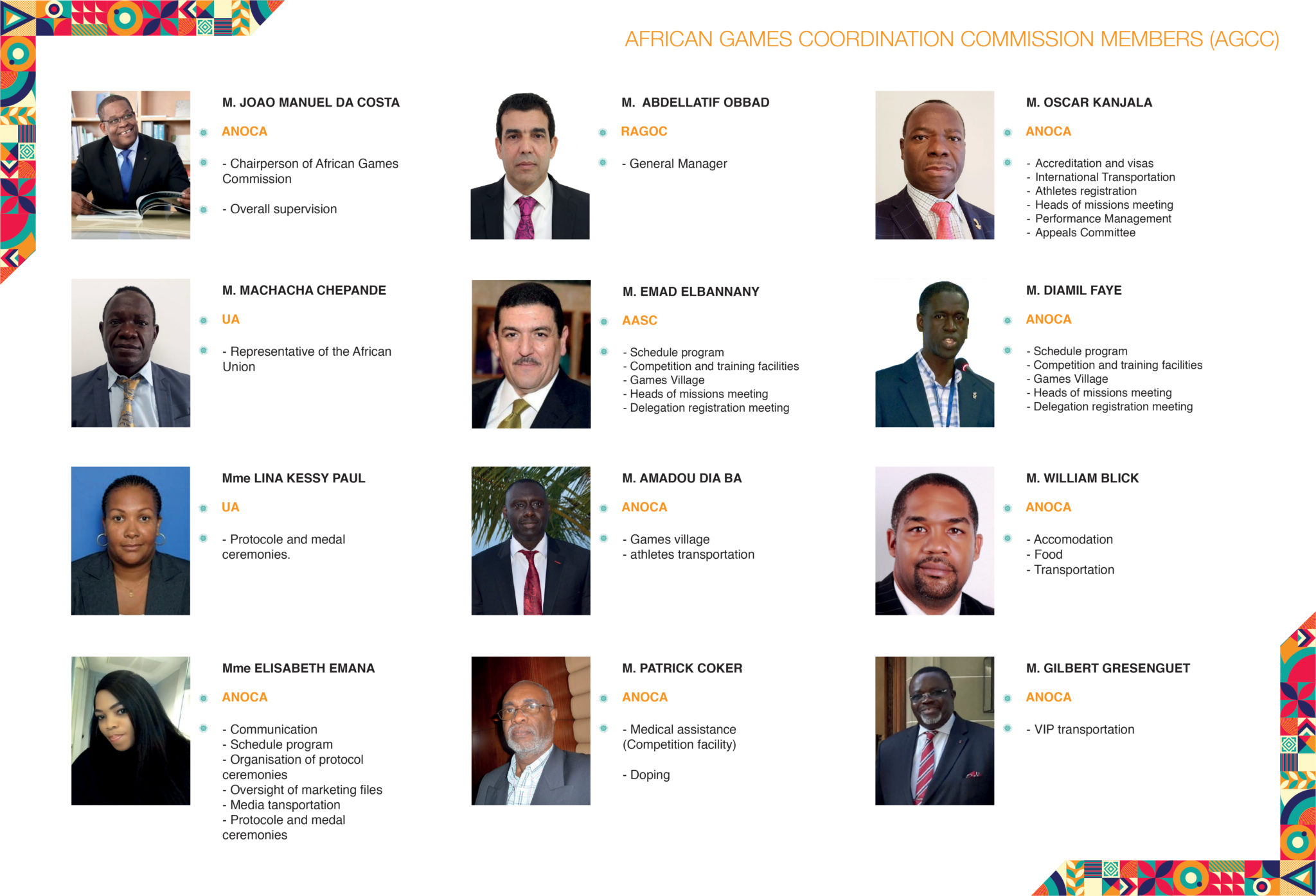 The African Games Coordination Commission (AGCC) is composed of representatives of thr African Union, the Association of National Olympic Committees of African and the Association of African Sports Confederations. The Commission coordinates the technical and organization aspects of the 12th edition of the African Games Rabat 2019, and assists the heads of the National Organization Committee (RAGOC) to fulfill their different functions.